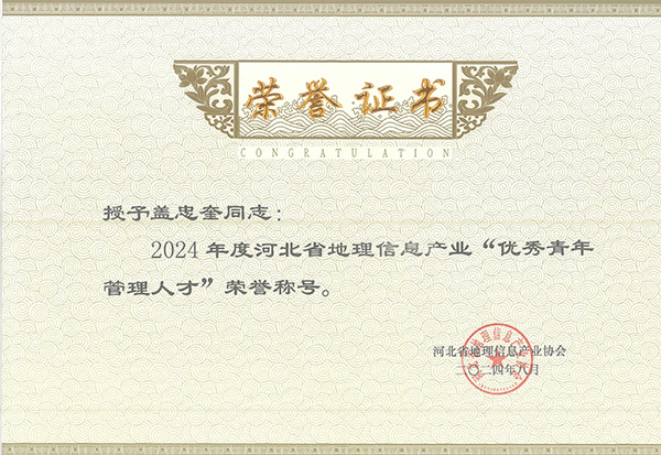 近期,由河北省地理信息產(chǎn)業(yè)協(xié)會評選,我公司被授予第五屆理事會“先進(jìn)工作單位”榮譽(yù)稱號和2022-2023年度河北省地理信息產(chǎn)業(yè)“十佳單位”榮譽(yù)稱號,蓋忠奎同志榮獲2024年度河北省地理信息產(chǎn)業(yè)“優(yōu)秀青年管理人才”稱號。
